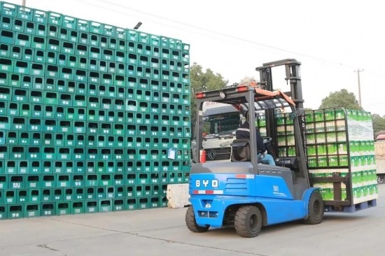 新能源叉車配置的磷酸鐵鋰電池,具有安全、環(huán)保的特性,且零排放、無(wú)污染,在保障生產(chǎn)環(huán)境安全作業(yè)的同時(shí),為廠區(qū)原材料食品安全筑起防護(hù)墻,嚴(yán)格杜絕了原材料在搬運(yùn)過(guò)程中遭受二次污染的可能。同時(shí)比亞迪鋰電池叉車性能可靠、動(dòng)力強(qiáng)勁、隨充隨用、壽命長(zhǎng),可充分滿足啤酒企業(yè)高負(fù)荷運(yùn)轉(zhuǎn)需求。